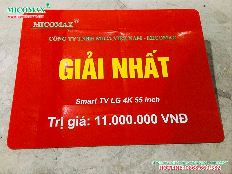Các sản phẩm in ấn trên mica rất đa dạng, chủ yếu là sản phẩm gia công. Ngoài công đoạn in UV lên bề mặt tấm mica, các sản phẩm từ mica còn được cắt, dán, uốn, đánh bóng để tạo thành các sản phẩm khác nhau như biển chức danh mica để bàn, menu mica, kệ đựng tờ rơi in logo, hòm phiếu mica,…